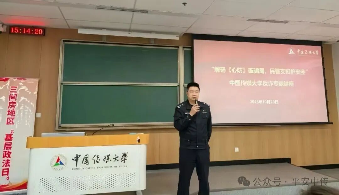 为切实提升师生反诈防骗意识与自我保护能力,筑牢校园安全防线,10月29日下午,保卫部(处)、学生工作部(处)联合朝阳公安分局、三间房乡政府、三间房派出所及相关司法单位,共同举办“解码《心防》破骗局,民警支招护安全”反诈专题讲座暨三间房地区基层政法日主题活动。