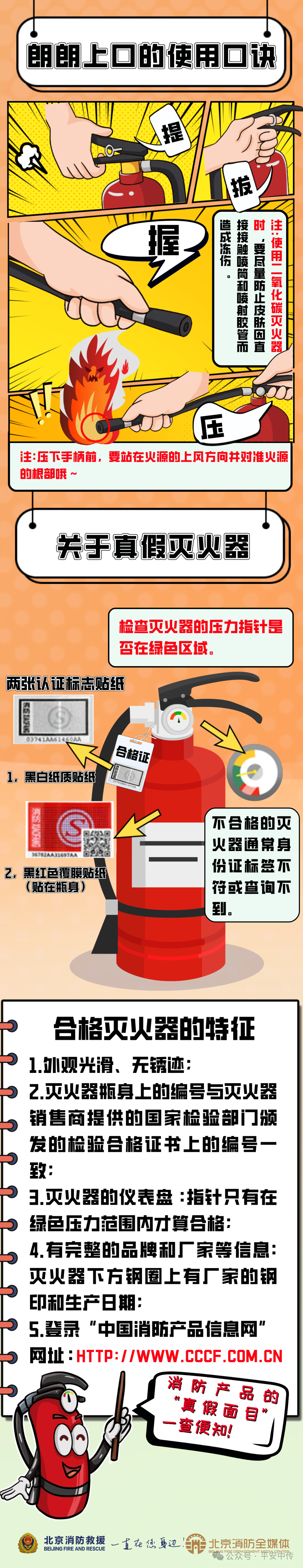 灭火器的使用,牢记四字口诀“提、拔、握、压”。