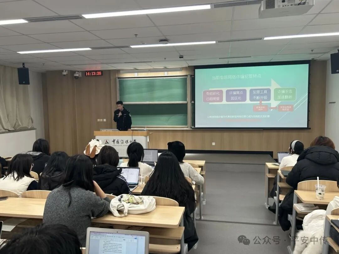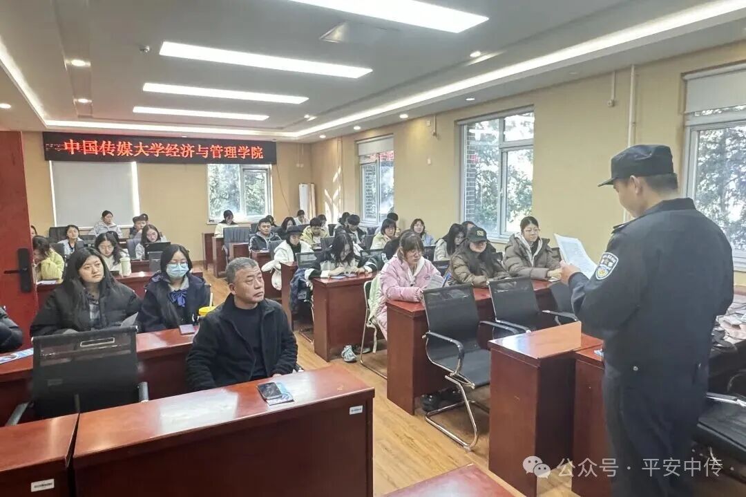 为切实增强师生防范电信网络诈骗的意识和能力,筑牢校园安全防线,近日,保卫部(处)联合三间房派出所、公共交通安全保卫总队四惠站派出所,为经济与管理学院、文化产业管理学院、外国语言文化学院、政府与公共事务学院、数据科学与智能媒体学院、信息传播学院、艺术研究院的师生带来了第三期的“安全教育送上门”系列讲座,将安全知识精准送达师生身边。